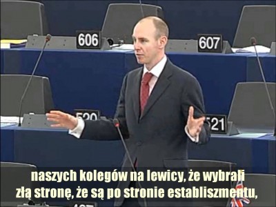 Zauważyłem dziś w porannej debacie, że jakby zaczyna docierać do niektórych naszych kolegów na lewicy, że wybrali złą stronę, że są po stronie establiszmentu, obligatariuszy i banków przeciwko zwykłym...